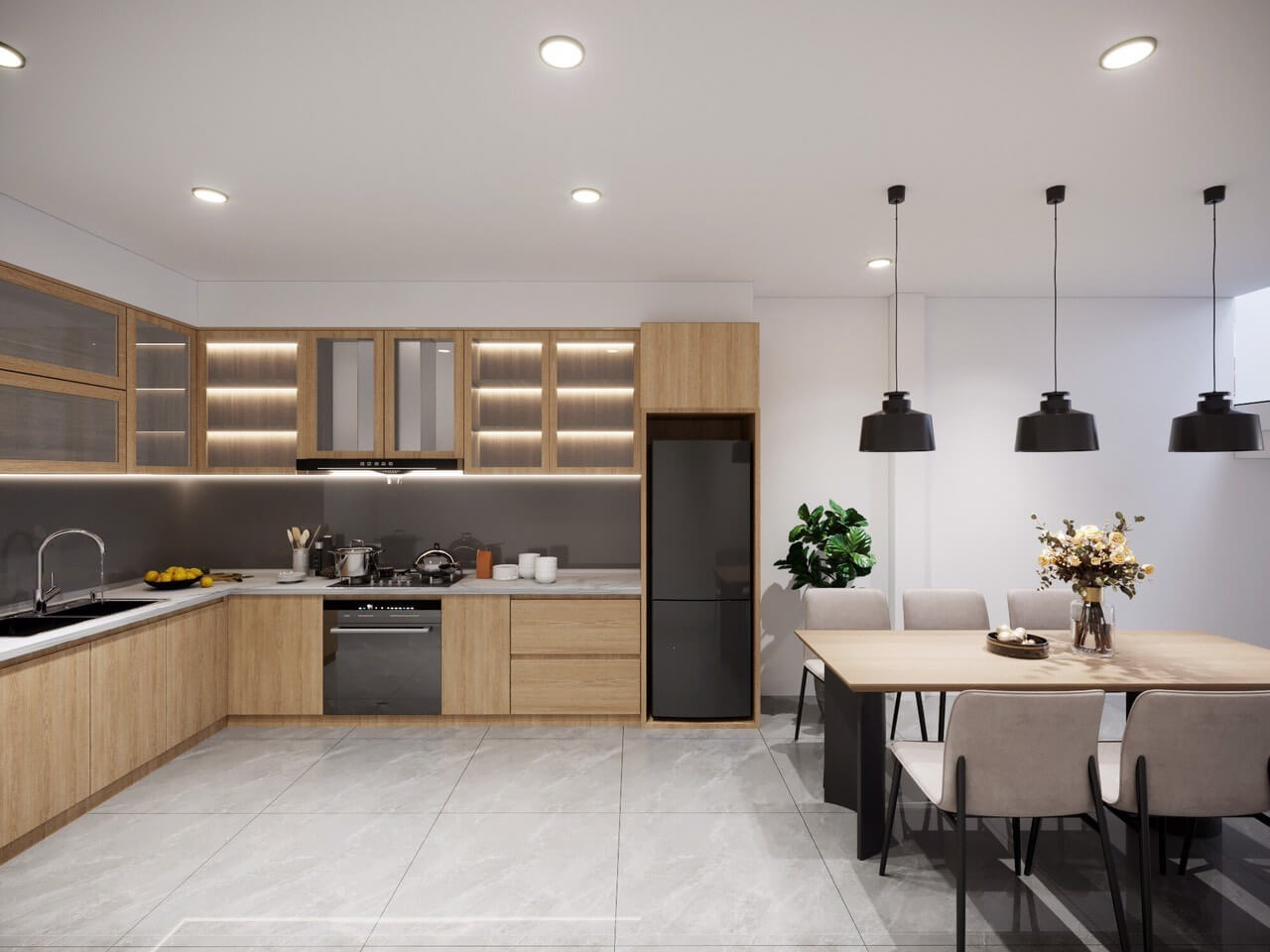 Thiết kế không gian mở giúp tối đa hóa không gian sống, tạo cảm giác rộng rãi và thoáng đãng. Việc sử dụng các cửa kính lớn và giếng trời giúp ánh sáng tự nhiên tràn ngập vào không gian, tiết kiệm năng lượng và tạo cảm giác thoải mái.