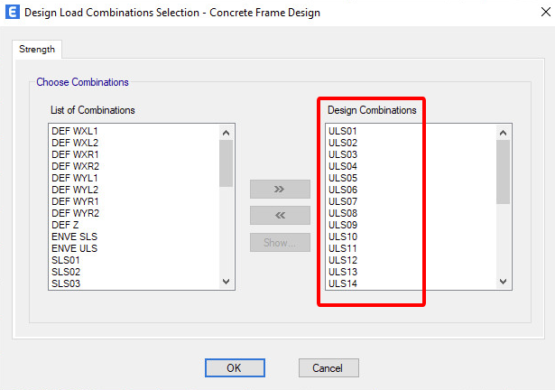 Chọn các các loại tổ hợp cần tính toán thép cho cột (trường hợp không chọn thì tiêu chuẩn sẽ tự động tạo ra tổ hợp mới):