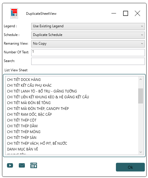 Giao diện của công cụ Duplicate Sheet. Người dùng Chọn Sheet cần copy và điền các thông tin cần copy. Công cụ tạo thêm Sheet từ những Sheet đã có trước trong project.
